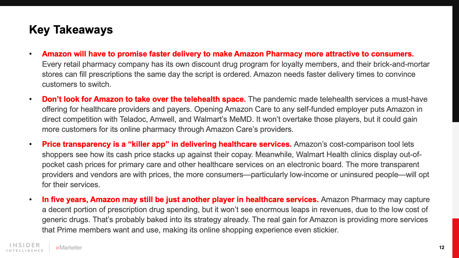 WHAT’S IN THIS REPORT? This report presents our first look at Amazon’s forays into the consumer side of the US healthcare space and examines its potential impact on healthcare delivery as well as consumer choices in the future.